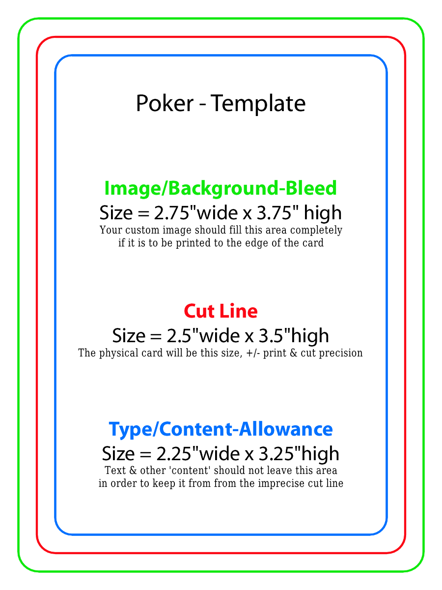 DO YOU HAVE TEMPLATES AVAILABLE FOR DESIGNING MY CARDS?:Yes we do! Poker-sized cards, Bridge-sized cards |