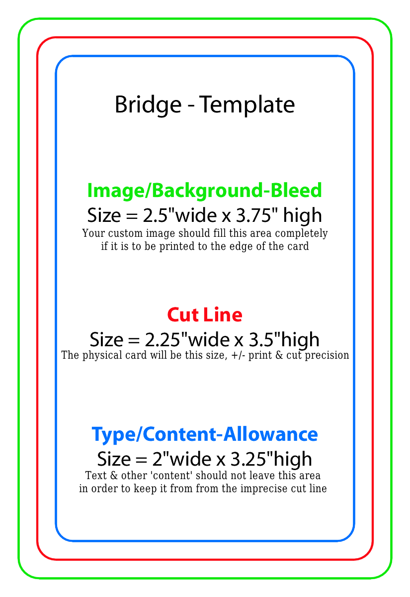 DO YOU HAVE TEMPLATES AVAILABLE FOR DESIGNING MY CARDS?:Yes we do! Poker-sized cards, Bridge-sized cards |